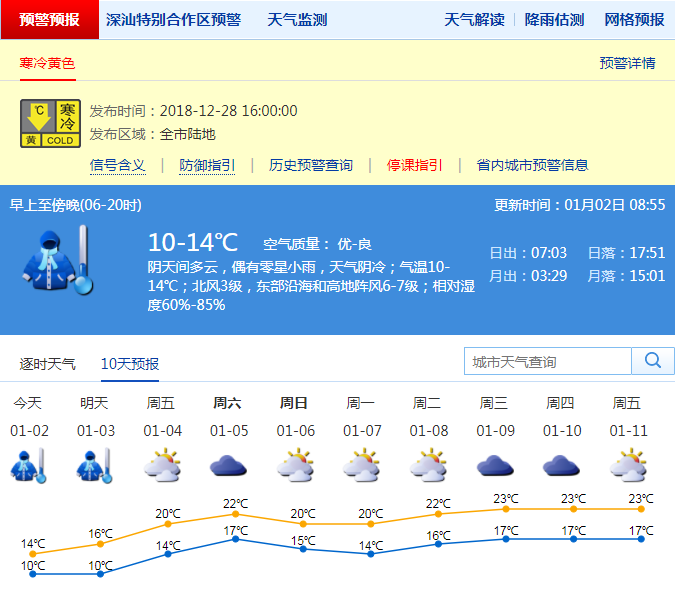 深圳新聞網(wǎng)2019年1月2日訊(記者 陳婕)記者從深圳市氣象局了解到,2日有分散小雨;9-13℃;北風(fēng)3級(jí),東部沿海和高地陣風(fēng)6-7級(jí);濕度60%-85%。預(yù)計(jì)3日持續(xù)陰冷;4-5日陰天間多云,偶有零星小雨,最低氣溫明顯回升;6日起多云到晴天,氣溫小幅波動(dòng)。