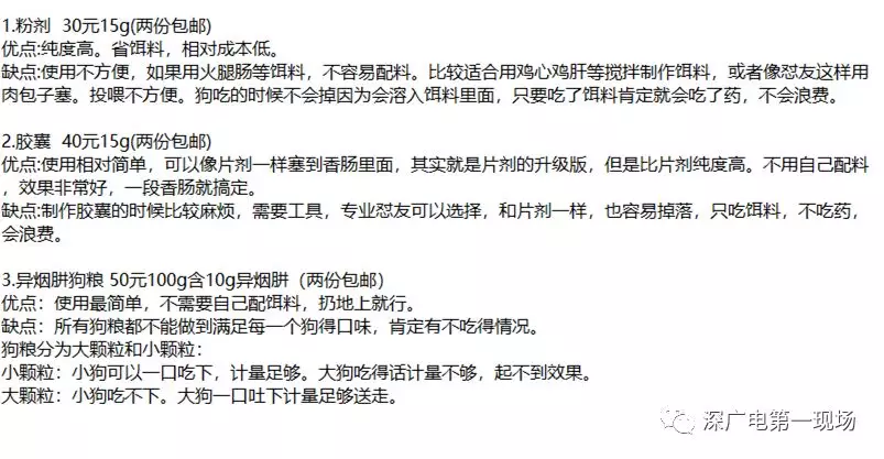 今天上午,記者通過(guò)搜索,找到了一名專(zhuān)門(mén)售賣(mài)異煙肼的網(wǎng)友,對(duì)方給出了粉劑、膠囊、異煙肼狗糧三種套餐,每種套餐中還特地標(biāo)明了針對(duì)寵物狗的配料優(yōu)缺點(diǎn),并且直接將寵物狗吃下后的效果也標(biāo)明在其中。