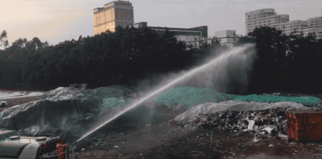 大部分垃圾都已被遮蓋,一輛環(huán)衛(wèi)車正在噴水處理