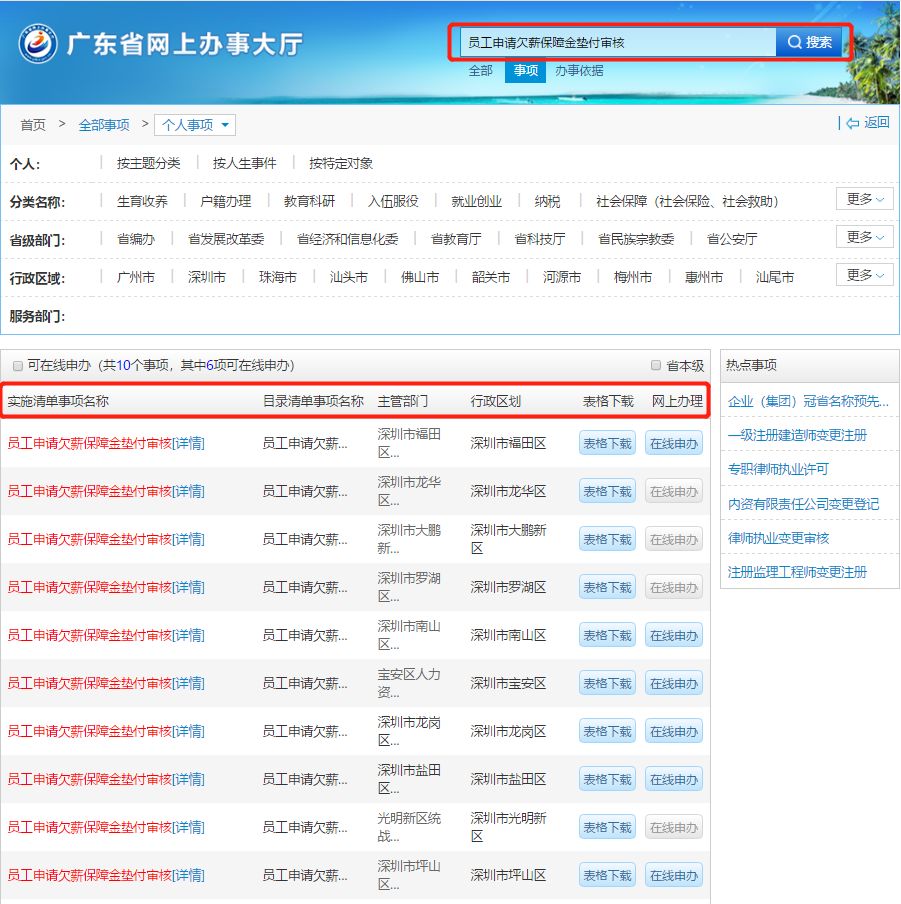答:員工登錄廣東省網(wǎng)上辦事大廳官網(wǎng),點(diǎn)擊“個(gè)人事項(xiàng)”,在搜索欄中輸入“員工申請欠薪保障金墊付審核”,可查詢到各區(qū)“員工申請欠薪保障金墊付審核”事項(xiàng),選擇所在區(qū)點(diǎn)擊“詳情”,即可查詢到所在區(qū)人力資源部門的咨詢電話、辦理地址、辦理時(shí)間和交通指引等相關(guān)信息。