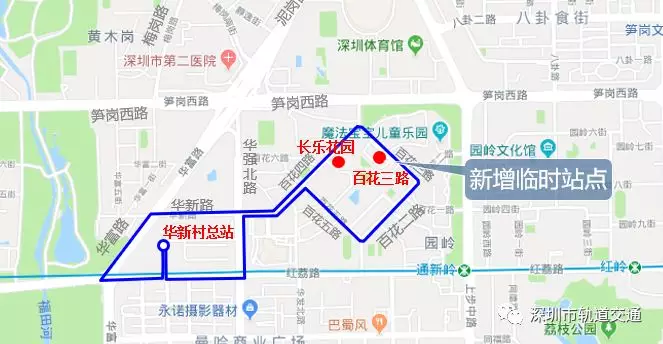 (2)新增華新村總站環(huán)線(單邊順時針運行),線路單向途經(jīng)華富路、華新路、百花四路、百花三路、百花二路、百花五路、百花四路、華強北路、紅荔路。??咳A新村總站、華新村、市話大廈①、華新路、百花四路、長樂花園、百花三路、百花二路、百花村、百花四路、華新村總站。(詳見圖6)