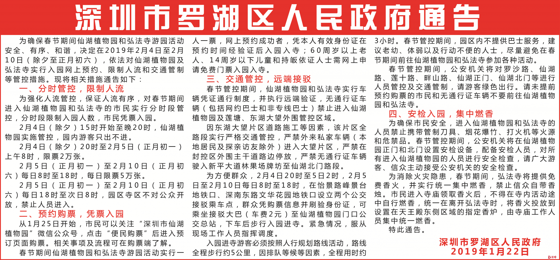 深圳特區(qū)報2019年01月22日訊 春節(jié)臨近,許多市民對今年春節(jié)期間仙湖植物園和弘法寺游園活動的相關安排非常關心。1月22日,羅湖區(qū)政府就此發(fā)布了正式通告。