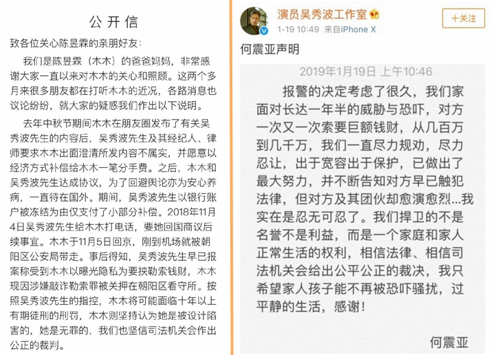 深圳新聞網(wǎng)1月22日訊(記者 張玲)近日,演員吳秀波婚內(nèi)出軌事件再度發(fā)酵在微博引發(fā)熱搜,而這次事件的主角則是之前銷聲匿跡已久的陳昱霖(藝名)。2019年1月18日,陳昱霖父母微博公開發(fā)表聲明稱女兒被吳秀波欺騙回國(guó)后,吳秀波以“曝光隱私威脅勒索錢財(cái)”為由報(bào)警,女兒在下飛機(jī)后即被警方抓捕。隨后,吳秀波妻子何震亞發(fā)表聲明反擊,稱陳昱霖多次威脅索要巨額財(cái)務(wù),數(shù)額一度高達(dá)千萬,在忍無可忍的情況下才選擇報(bào)警,希望通過司法途徑維護(hù)自己的權(quán)益。