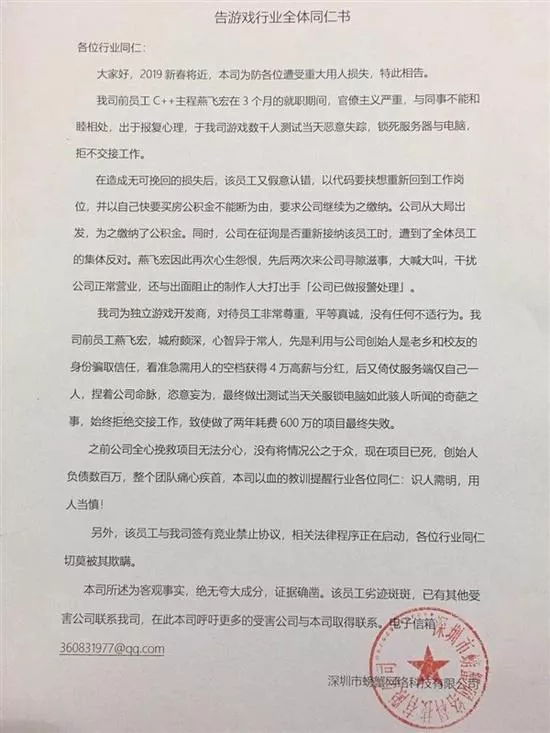 1月20日,深圳市螃蟹網(wǎng)絡科技有限公司創(chuàng)始人尹柏霖發(fā)文控訴,前員工燕某在游戲上線測試當天(2017年12月15日),鎖死服務器與電腦,并惡意失蹤,致公司損失慘重。尹柏霖稱,“我們上線不了也測試不了,等新員工到職后熟悉新代碼又是幾個月過去了。”