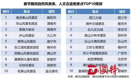 除了返鄉(xiāng)外,春節(jié)同樣是外出旅游的好時(shí)機(jī)。據(jù)《報(bào)告》預(yù)測,在全國259家5A級旅游景點(diǎn)中,南岳衡山風(fēng)景區(qū)、華山風(fēng)景名勝區(qū)、恩施大峽谷將排名最火爆自然風(fēng)景類景區(qū)前三,麗江古城、閬中古城景區(qū)、臺兒莊古城則是最具人氣的人文古跡類景區(qū)前三。