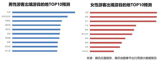 根據(jù)性別劃分,女性游客最感興趣的目的地是法國、泰國、瑞士、日本、韓國等國家,要么是浪漫之都,要么是購物天堂;而男性游客的興趣則更為廣泛,占比最多的目的地包括印度、印度尼西亞、阿聯(lián)酋、俄羅斯、菲律賓等。