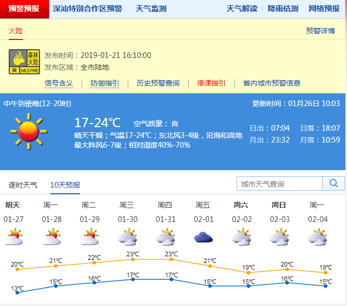 深圳新聞網(wǎng)2019年1月26日訊 今日氣溫17-24℃,晴天干燥,相對濕度40%-70%。深圳市氣象局預(yù)計2019-01-27:晴天間多云,天氣干燥氣溫:12-20;2019-01-28:晴天間多云氣溫:15-21;2019-01-29:晴天間多云氣溫:16-21;2019-01-30:多云氣溫:17-22;2019-01-31:多云氣溫:17-23;2019-02-01:陰天間多云,有零星小雨氣溫:15-21;2019-02-02:多云氣溫:15-19;2019-02-03:多云氣溫:16-20;2019-02-04:陰天間多云,有分散小雨氣溫:15-19