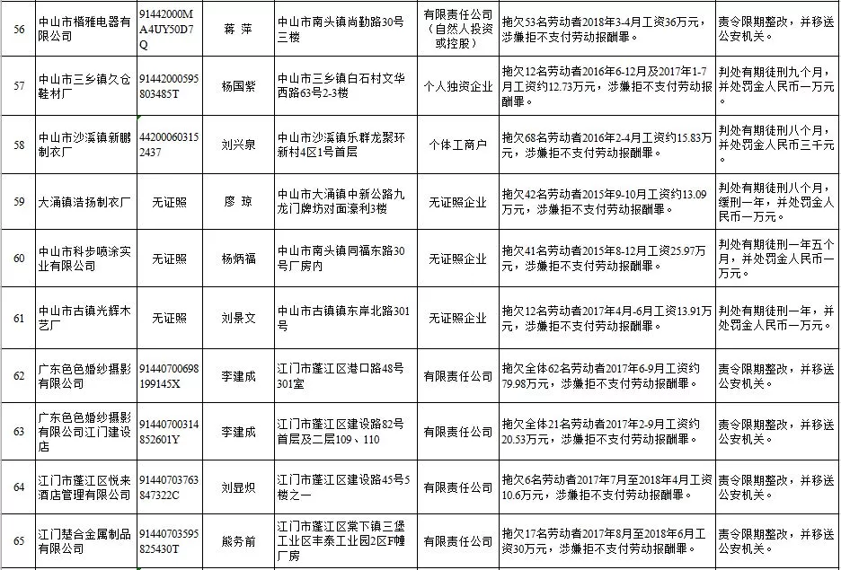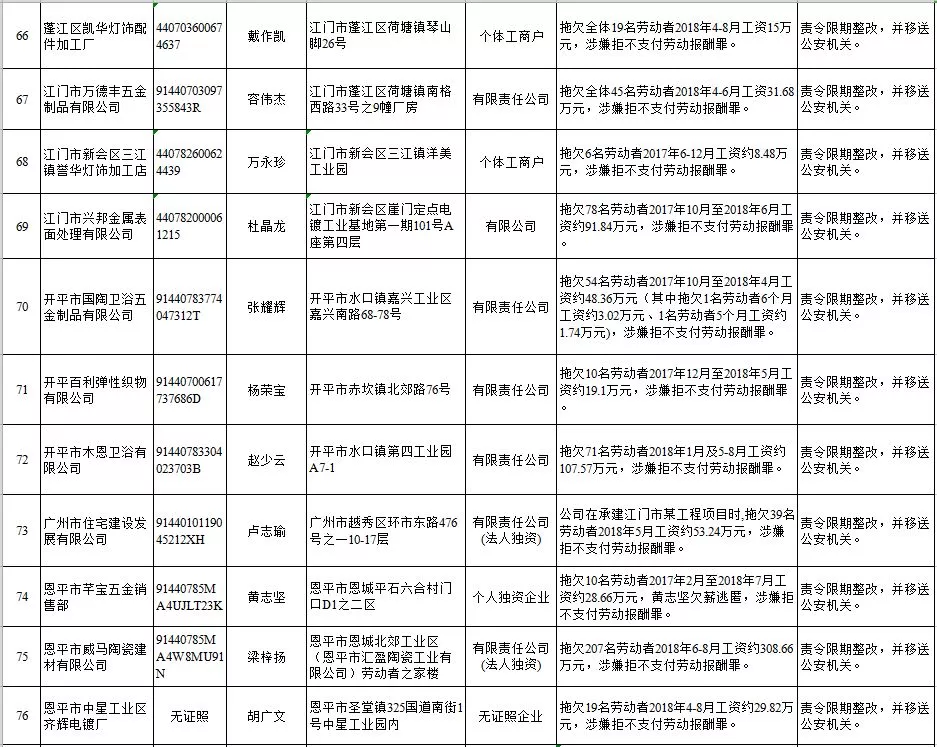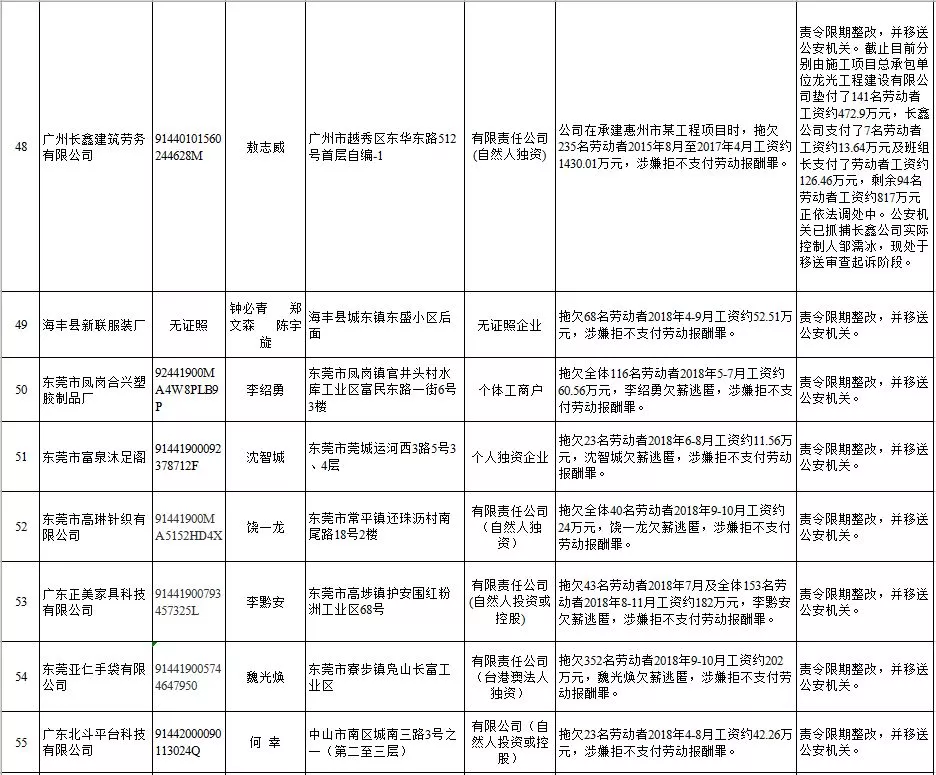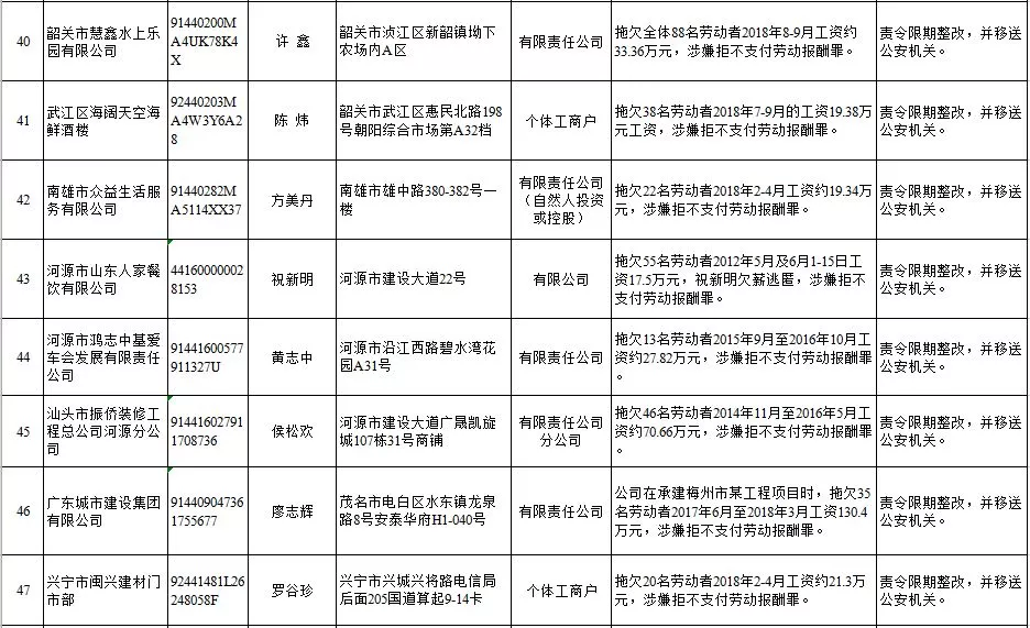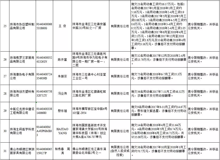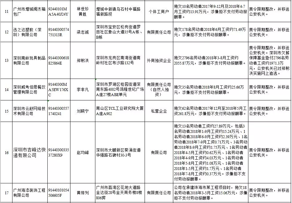 深圳新聞網(wǎng)2019年1月29日訊 (記者 劉婷)據(jù)廣東發(fā)布消息,省人社廳近日公布,2019年第一批用人單位重大勞動(dòng)保障違法行為名單。到底是哪些企業(yè)在惡意欠薪?這些“老賴”企業(yè)的營(yíng)業(yè)執(zhí)照、地址、法人等等超全信息都在這!