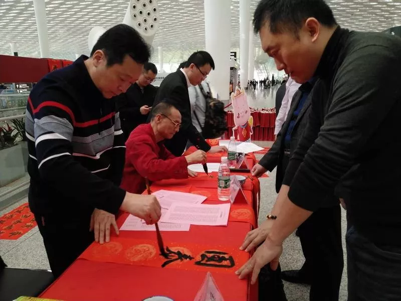 ▲旅客們請(qǐng)書(shū)法家們寫(xiě)春聯(lián),把“?!睅Щ丶?