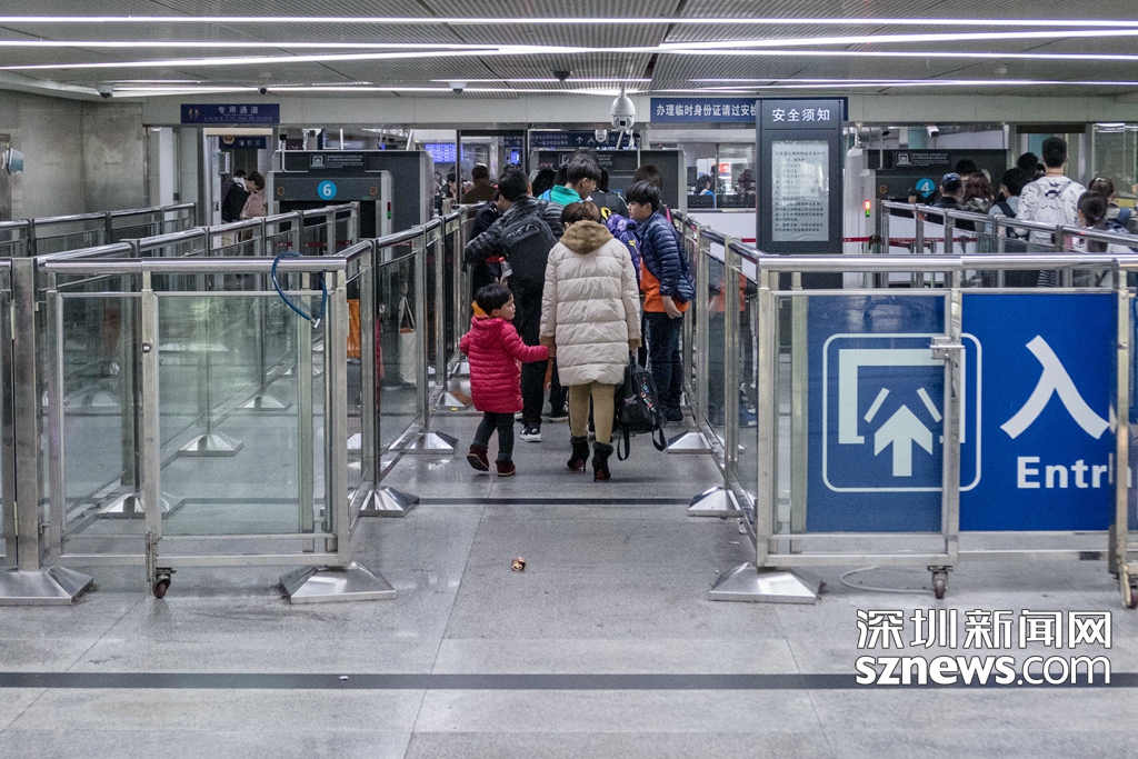 2月2日18:10深圳站廣深列車進站處,旅客安檢進站(實習生 關天宇攝)
