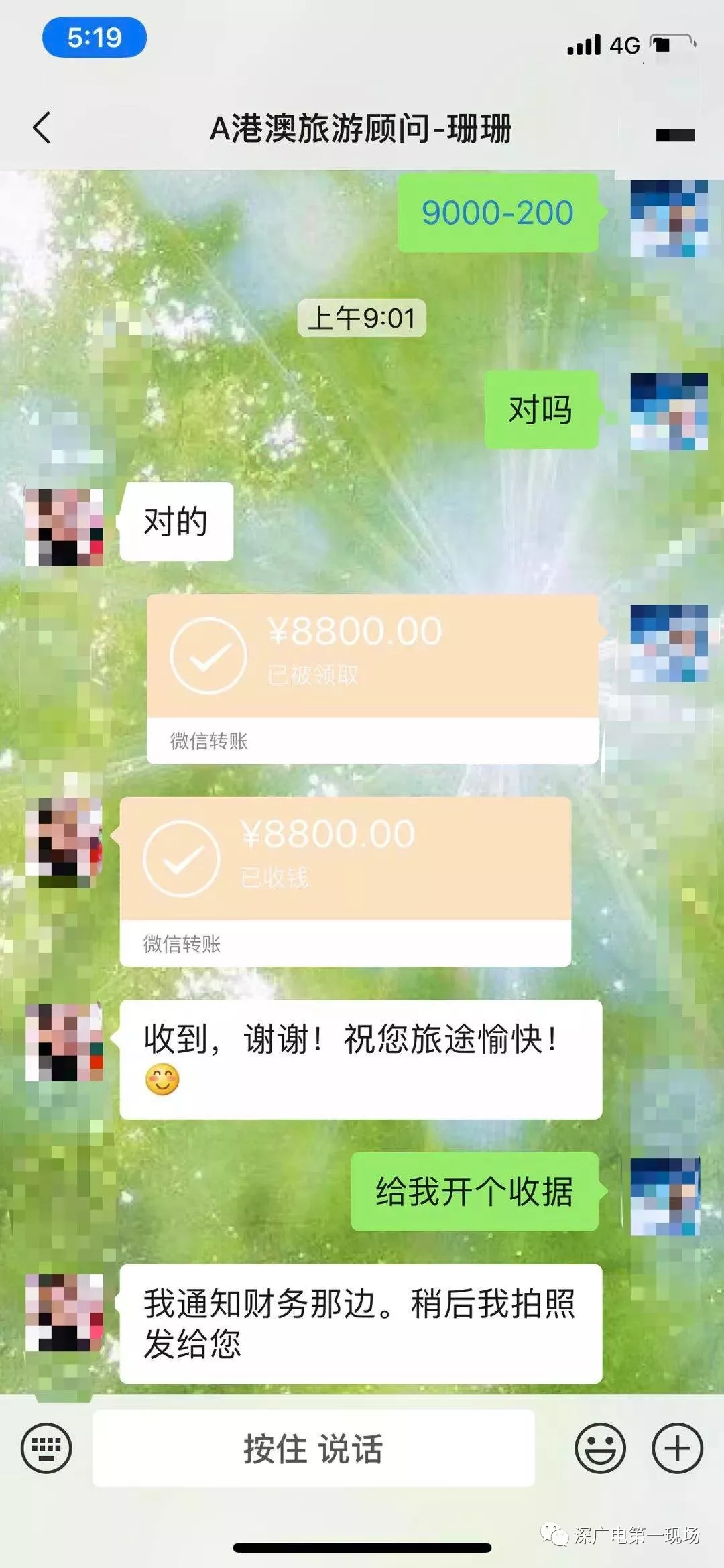 8號上午,記者先后用電話、微信等方式聯(lián)系上了,剛躲進(jìn)香港海港城馬哥孛羅酒店的李女士。她說,1月31日通過百度搜索“港澳游”,與深圳北方大廈7樓的國旅,微信名叫“珊珊”的旅游顧問聯(lián)系,在支付了200元定金后,于2月6日,從北京飛抵深圳入住了“珊珊”安排的鵬威酒店,并與“珊珊”的同事簽訂了合同。李女士夫婦和他們的孩子以及父母5人,以平均1800元的團(tuán)費價格,參加25-30人的5天4晚精品豪華團(tuán),赴香港澳門游玩,精品團(tuán)豪華的內(nèi)容是無購物、住“四星”的香港君逸酒店。2月7日上午,他們就從口岸過關(guān)到了香港。