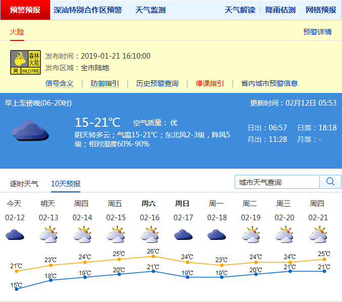 記者從深圳市氣象局了解到,昨日受冷空氣影響,早晨最低氣溫在14-16℃,較春節(jié)假期明顯變涼,因為云量較多,白天氣溫在17℃左右徘徊;預計12日起冷空氣逐漸減弱,氣溫逐日上升,早晚能見度逐漸轉差,氣溫在15-21℃;15-16日多云間晴天,早晚有輕霧或霧,中午前后較熱;17-18日弱冷空氣影響,有分散小雨,氣溫下降,沿海和高地陣風7-8級。