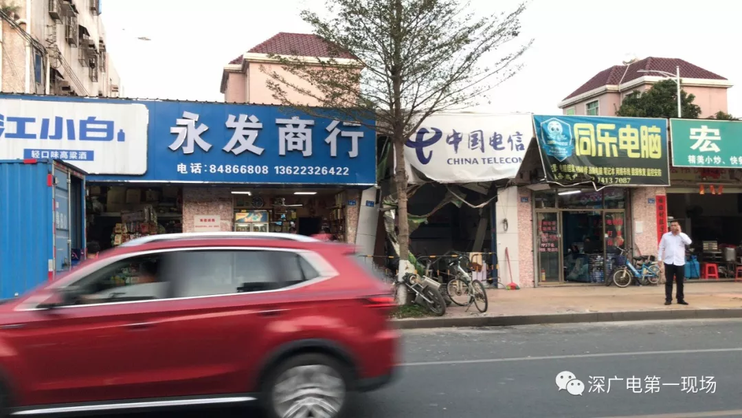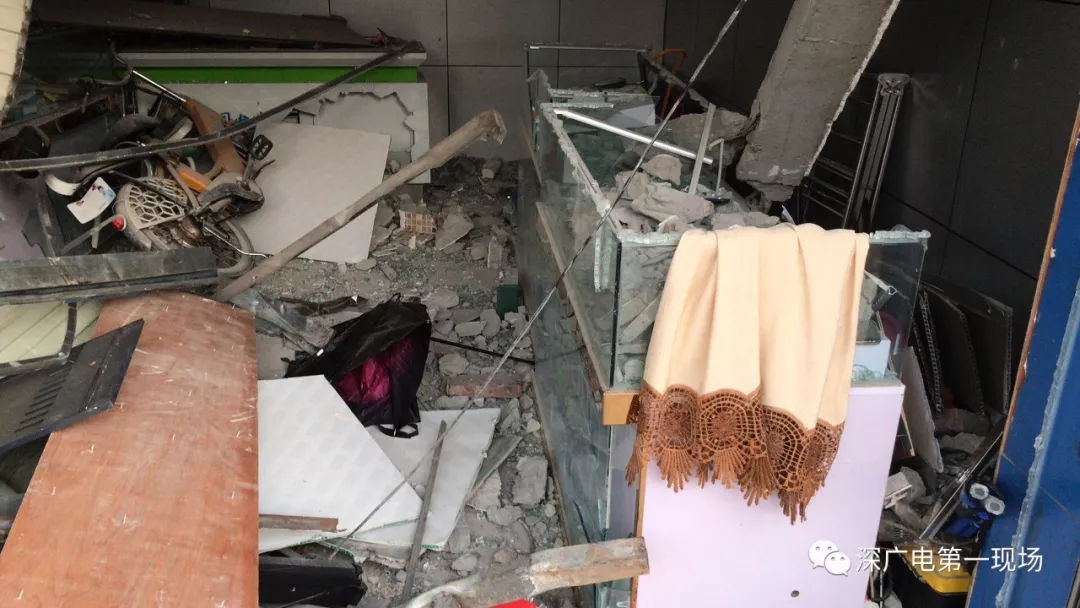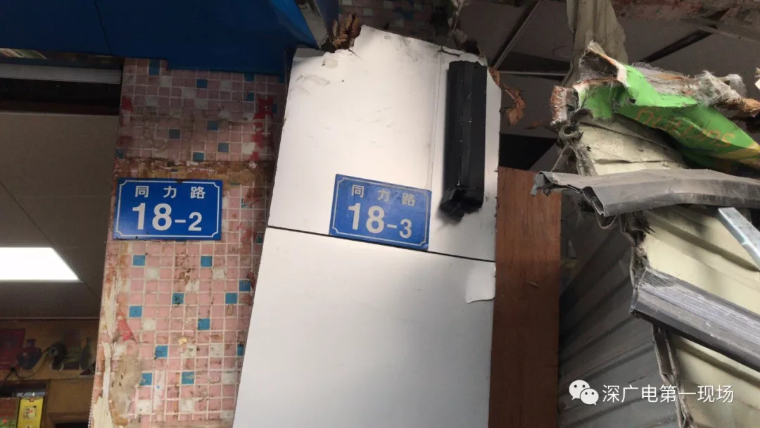 公交車撞上的位置涉及三個店面,其中一個店面受損比較嚴(yán)重,另外兩家店鋪只損壞了廣告牌。