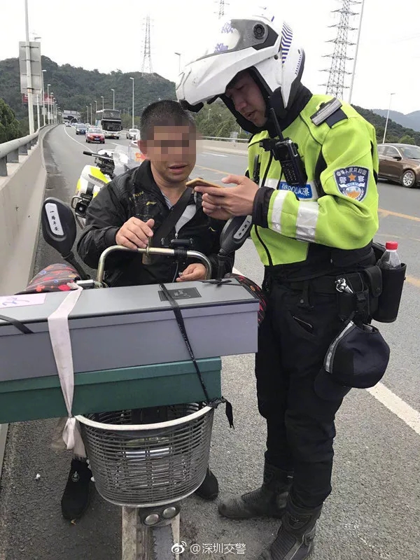 2月14日上午,深圳交警巡邏至南坪快速長嶺陂大橋時發(fā)現(xiàn)一輛非機動車上快速路。上前詢問后得知,男子是幫客戶送禮物的,不料卻迷路了,這才誤闖了快速路。蜀黍?qū)ζ浣逃?,迅速將當事人護送下快速路路口。