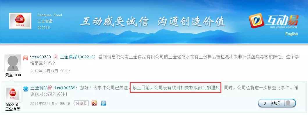 中新經(jīng)緯客戶(hù)端報(bào)道,14日晚間,有投資者在深交所互動(dòng)平臺(tái)上提問(wèn)三全食品稱(chēng),有消息稱(chēng)三全灌湯水餃有三份樣品被檢測(cè)出非洲豬瘟病毒核酸陽(yáng)性,該事件是否真實(shí)?