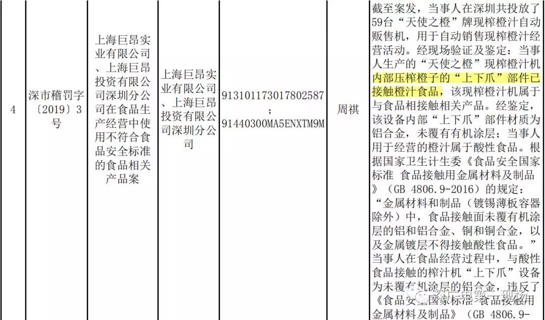 深廣電第一現(xiàn)場(chǎng)2019年2月19日訊 18日我們報(bào)道了,“天使之橙”現(xiàn)榨橙汁自動(dòng)販?zhǔn)蹤C(jī),其生產(chǎn)的現(xiàn)榨橙汁機(jī),內(nèi)部壓榨橙子的鋁合金“上下爪”部件,已接觸橙汁食品。根據(jù)《食品接觸用金屬材料及制品》相關(guān)標(biāo)準(zhǔn),其涉嫌違反《食品安全法》,被深圳市市場(chǎng)稽查局開出巨額罰單,沒收其違法所得1199070元。
