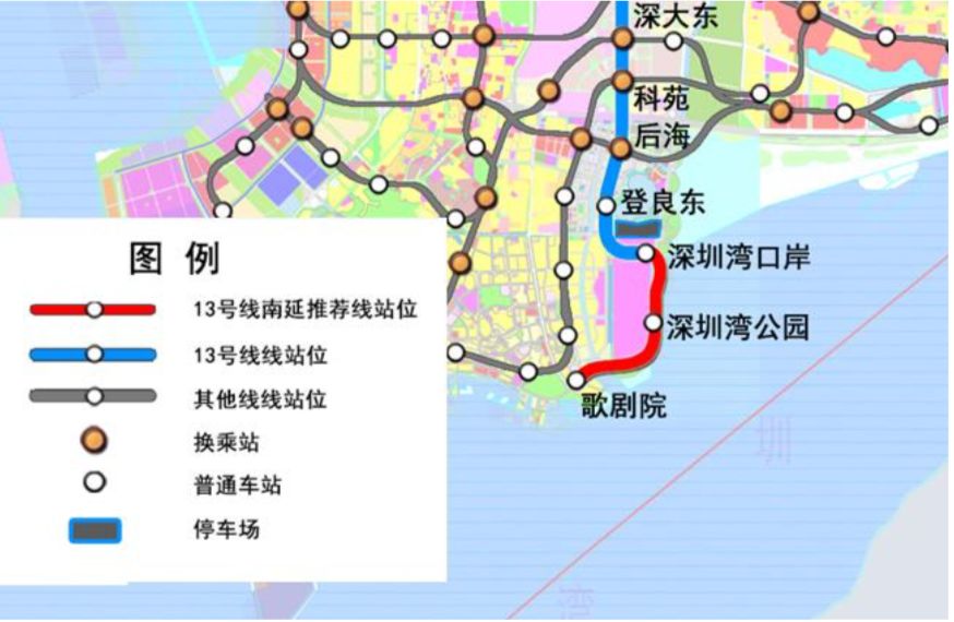13號(hào)線南延線將服務(wù)規(guī)劃十大重要文體設(shè)施—深圳市歌劇院,并提高深圳灣公園的軌道服務(wù)水平。線路由深圳灣口岸站站后引出,出站后沿望海路東側(cè)向南敷設(shè),上跨東濱路隧道后于深圳灣公園婚慶公園停車(chē)場(chǎng)設(shè)深圳灣公園站;出站后線路向西南方向敷設(shè),與望海路交叉兩次后沿望海路南側(cè)深圳灣公園運(yùn)動(dòng)公園向西敷設(shè),再次下穿望海路后沿望海路西側(cè)敷設(shè),終止于后海大道東北側(cè),設(shè)歌劇院站。