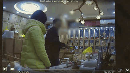 秦女士告訴記者,其實(shí)此時(shí)錢(qián)已經(jīng)被掉包了。從監(jiān)控視頻中可以發(fā)現(xiàn),這位顧客在秦女士去冰柜拿茶葉,小娟在檢查第一張100元時(shí),疑似從外套里拿出了一張假幣壓在了錢(qián)包底下。