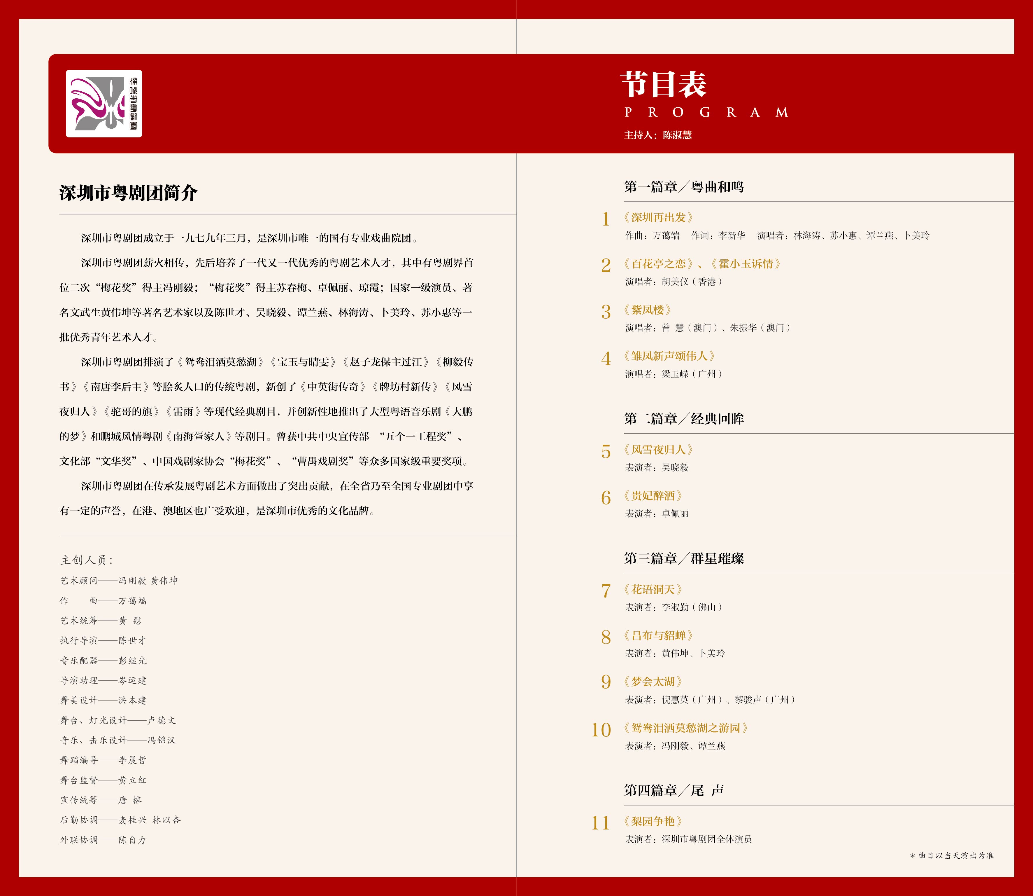 據(jù)悉,晚會劇目既有深圳粵劇團原創(chuàng)經(jīng)典粵劇唱段,也有粵劇粵曲傳世名段,還有新創(chuàng)的現(xiàn)代和現(xiàn)實題材唱段。一首粵曲聯(lián)唱《深圳再出發(fā)》表達了藝術(shù)家們對深圳這座城市無限的熱愛和不變的情懷,唱響了整場演出的前奏;著名粵曲藝術(shù)家梁玉嶸經(jīng)典作品《雛鳳新聲頌偉人》,用優(yōu)美的曲調(diào)和真實的情感,歌頌偉人鄧小平的豐功偉績;更有香港、澳門、廣州、深圳、佛山多地粵劇藝術(shù)家的拿手好戲:《夢會太湖》(倪惠英、黎駿聲主演)、《鴛鴦淚灑莫愁湖之游湖》(馮剛毅、譚蘭英主演)、《花語洞天》(李淑琴主演)、《貴妃醉酒》(卓佩麗主演)、《呂布與貂蟬》(黃偉坤、卜美玲主演)、《風(fēng)雪夜歸人》(吳曉毅主演)等戲迷們耳熟能詳?shù)慕?jīng)典曲目精彩呈現(xiàn)?;泟∨c粵曲、經(jīng)典與現(xiàn)代交相輝映,豪情鋪展新一輪深化國有文藝院團改革后呈現(xiàn)出的欣欣向榮。