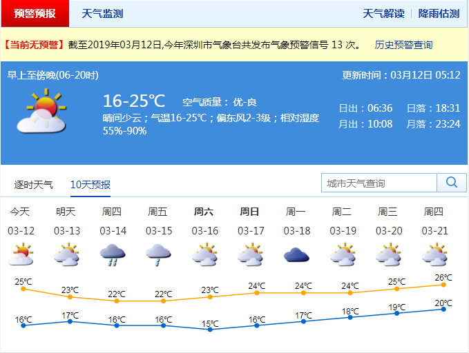 深圳新聞網2019年3月12日訊 今天白天,全市天氣大致晴好,可見陽光,早晚最低氣溫徘徊在16℃左右,中午前后最高氣溫升至25℃左右。天氣晴好,適合洗曬。但晝夜溫差大,注意及時增添衣物。