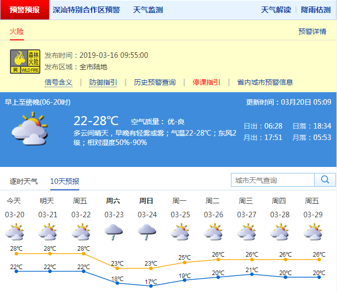 深圳新聞網(wǎng)2019年3月20日訊 深圳市氣象局預(yù)計20日多云間晴天,早晚有輕霧或霧;21-28℃;東風2級;濕度50%-90%。21日云量增多,偶有分散陣雨;22-23日多云轉(zhuǎn)雷陣雨,可能伴有7-8級短時大風,氣溫下降;24-25日間中有短時陣雨;26日起轉(zhuǎn)多云。
