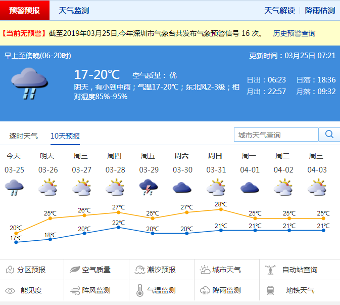深圳新聞網(wǎng)2019年3月25日訊 今日仍陰涼有雨,降雨主要出現(xiàn)在凌晨至午后,有小雨到中雨,局部大雨,可能有零散雷暴。深圳市氣象局預(yù)計(jì)26日起轉(zhuǎn)多云可見陽光,氣溫逐日回升,27-28日暖濕有霧,最高氣溫可回升至25℃以上。