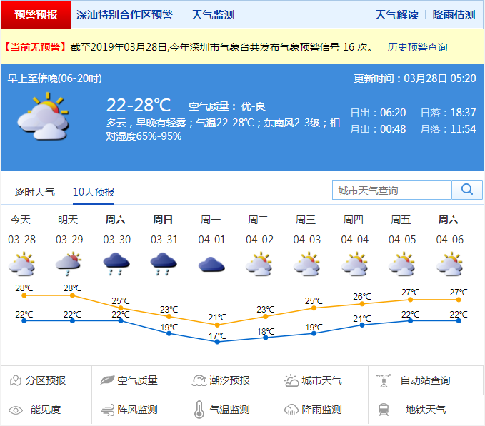 深圳新聞網(wǎng)2019年3月28日訊 深圳今日多云,早晚有輕霧或霧;20-27℃;南風(fēng)2-3級;濕度60%-95%。預(yù)計(jì)29日多云轉(zhuǎn)陣雨;30-31日冷空氣影響,陰天有陣雨或雷陣雨,天氣轉(zhuǎn)涼;4月1日陰轉(zhuǎn)多云,偶有零星小雨;2日起氣溫逐日回升。