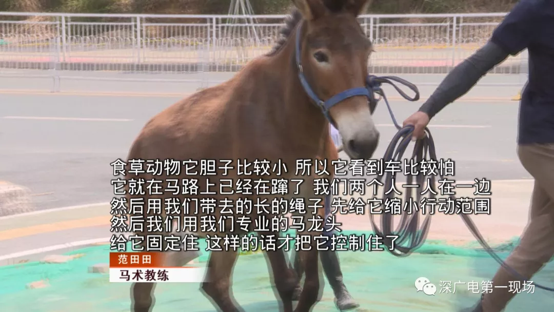 馴馬師馴騾子,終于安撫了焦慮情緒,所幸觀瀾山水田園馬場的工作人員在接到消息后立即趕到現(xiàn)場,及時安撫了已經(jīng)處在焦躁邊緣的騾子。