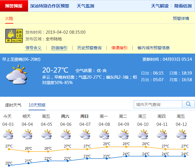 深圳新聞網(wǎng)2019年4月3日訊深圳今日氣溫20-27℃,多云,早晚有輕霧。4月3日至清明假期我市多云為主,降水少,氣溫高,空氣較干燥,沿海和高地間中有6-7級偏東風(fēng),氣象條件不利于降低火險風(fēng)險,森林火險預(yù)警信號將持續(xù)到清明假期。