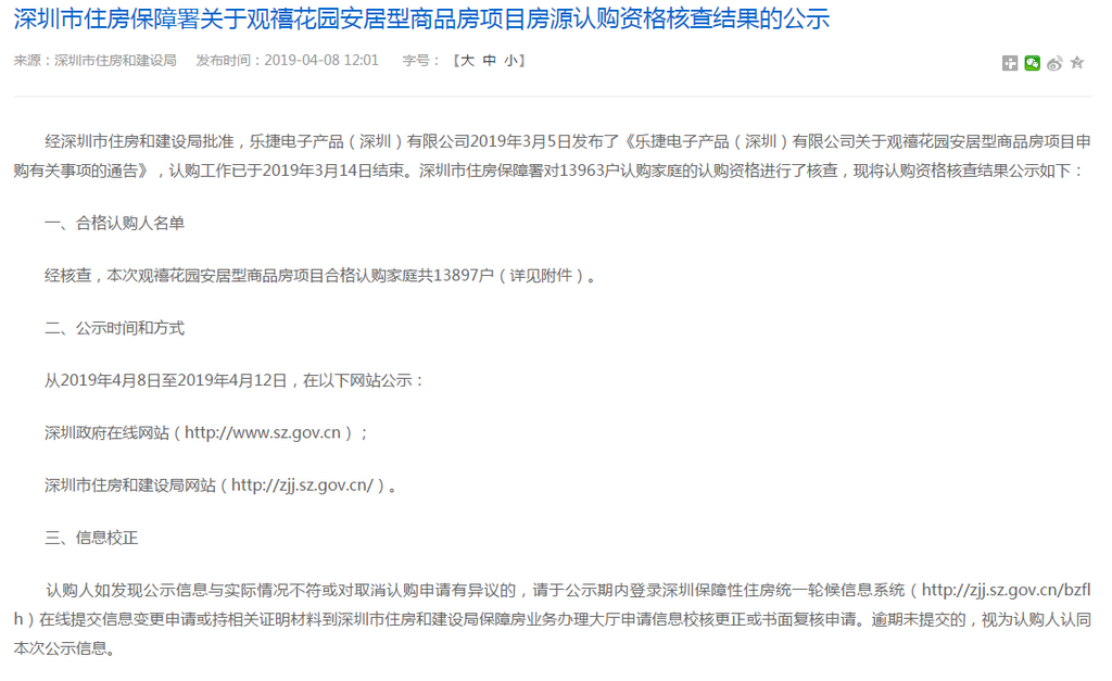 深圳新聞網(wǎng)2019年4月9日訊(記者 劉婷)記者從市住房保障署獲悉,觀禧花園安居型商品房項目認購工作已經(jīng)結束。經(jīng)核查,該項目合格認購家庭共13897戶,合格家庭名單自4月8日至4月12日在深圳政府在線和深圳市住房(http://www.sz.gov.cn)和建設局(http://zjj.sz.gov.cn/)網(wǎng)站公示。