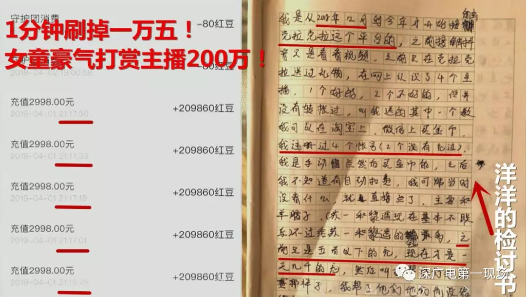 深廣電第一現(xiàn)場(chǎng)2019年4月12日訊 這兩天《第一現(xiàn)場(chǎng)》報(bào)道了11歲女童洋洋打賞某直播平臺(tái)主播近200萬(wàn)!家長(zhǎng)要求她寫了一份檢討書……