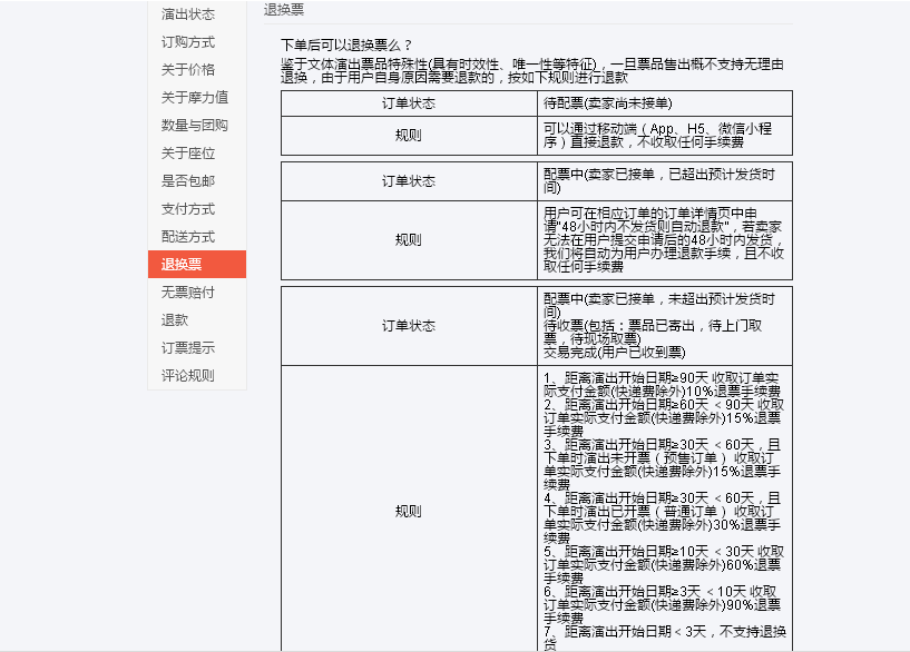 記者隨后從該網(wǎng)站的“訂票提醒”中的退換票規(guī)則中看到,該網(wǎng)站的退換票手續(xù)費(fèi)實(shí)行“階梯費(fèi)率”,如距離演出開始日期90天或以上,要收取訂單實(shí)際支付金額(快遞費(fèi)除外)10%退票手續(xù)費(fèi);距離演出開始日期3天或以上但不超過10天,要收取訂單實(shí)際支付金額(快遞費(fèi)除外)90%退票手續(xù)費(fèi),距離演出開始日期3天以內(nèi),則不支持退換貨。