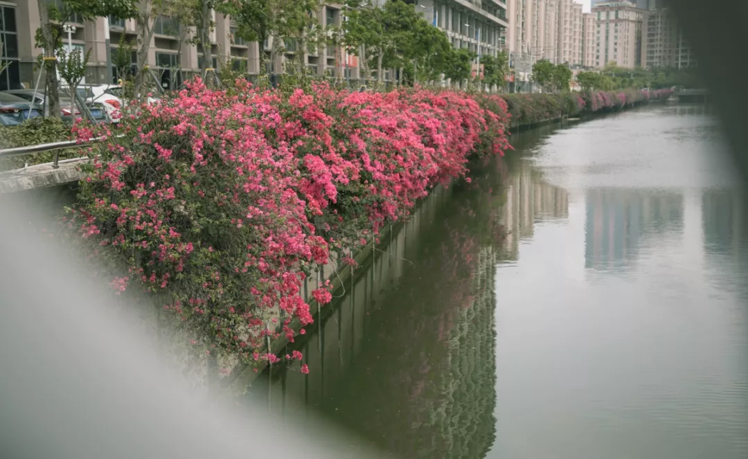 經(jīng)過(guò)寶安人不懈的努力,西鄉(xiāng)河已不見(jiàn)了黑臭的身影,此時(shí)盛開(kāi)的紅色、紫色勒杜鵑清晰地倒映在河面上。