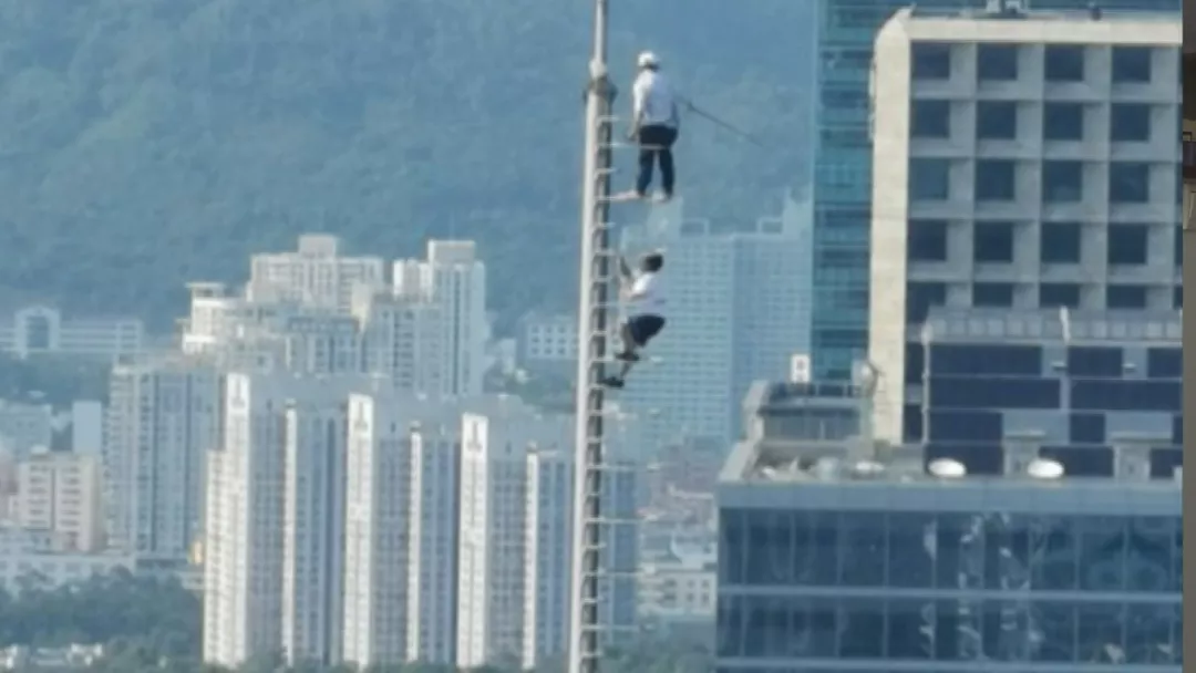 這段視頻拍攝于昨天上午9點左右,視頻拍攝者李先生表示,當(dāng)時他正在公司值班,往窗外一看,卻發(fā)現(xiàn)對面的信息樞紐大廈塔頂,靠近中國電信招牌的位置有動靜,定睛一看,居然是兩個人在塔頂?shù)蔫F桿上游走。