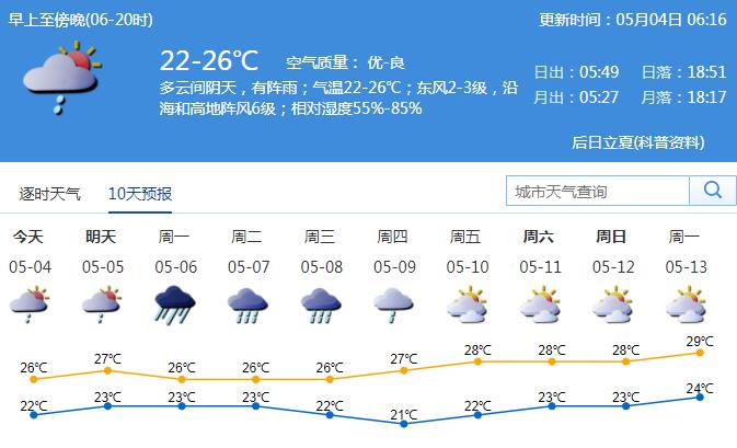 深圳特區(qū)報2019年5月4日訊(記者 方勝)深圳市氣象臺預(yù)計,4日我市多云,可見陽光,局部有短時陣雨,氣溫21-26℃,中午前后體感微熱;5-8日我市將出現(xiàn)強降雨,日雨量最大可達(dá)暴雨,部分時間伴有雷暴和短時大風(fēng);展望9日降雨減弱。5日起我市連續(xù)多日有強降雨,請市民及時關(guān)注最新預(yù)警預(yù)報信息。