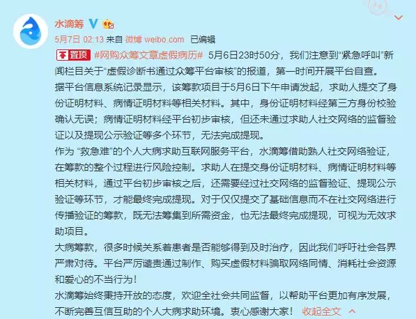 水滴籌官方微博稱,據(jù)平臺信息系統(tǒng)記錄顯示,記者提交的虛假眾籌款項目于5月6日下午申請發(fā)起,求助人提交了身份證明材料、病情證明等相關材料。