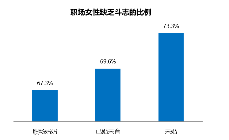盡管來自生活和事業(yè)的雙重壓力較大,但是職場媽媽的職場斗志依然高昂。調(diào)查顯示,整體來看職場女性不加班的比例不足三成,職場媽媽群體的加班強(qiáng)度略僅低于其他女性職場人,有31.1%的職場媽媽不用加班。雖然職場的外部競爭環(huán)境壓力大,但職場媽媽奮斗拼搏的精神氣很高。調(diào)研顯示,職場媽媽"經(jīng)常或偶爾出現(xiàn)缺乏工作斗志"的比例最低,為67.3%;已婚未育排在次位;未婚女性人群中缺少斗志的占比高達(dá)73.3%。