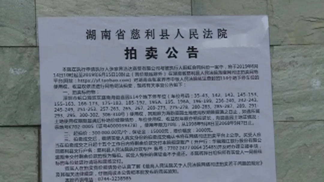 公告說(shuō),將強(qiáng)制拍賣(mài)114個(gè)停車(chē)位,網(wǎng)上拍賣(mài)時(shí)間是2019年6月14日至6月15日,落款是湖南省慈利縣人民法院。