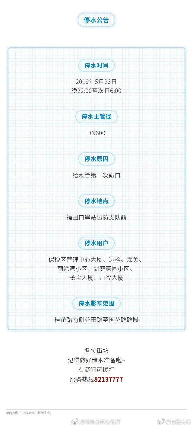 溫馨提醒!今天晚上22:00至明日6:00,福田區(qū)保稅區(qū)管理中心大廈、邊檢、海關(guān)、麗港灣小區(qū)、朗庭豪園小區(qū)、長寶大廈、加福大廈等區(qū)域?qū)⒂媱澩K?,各位街坊記得做好儲水準備啊!戳下圖了解更多停水停電資訊!