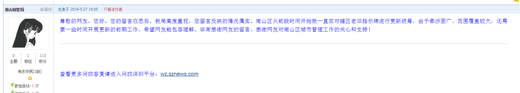 為及時(shí)解決網(wǎng)友疑問(wèn),5月27日下午,南山城管局在網(wǎng)友“syh19667288”發(fā)布的帖文下給予回復(fù)稱需要時(shí)間來(lái)開(kāi)展更新工作。具體回復(fù)如下: