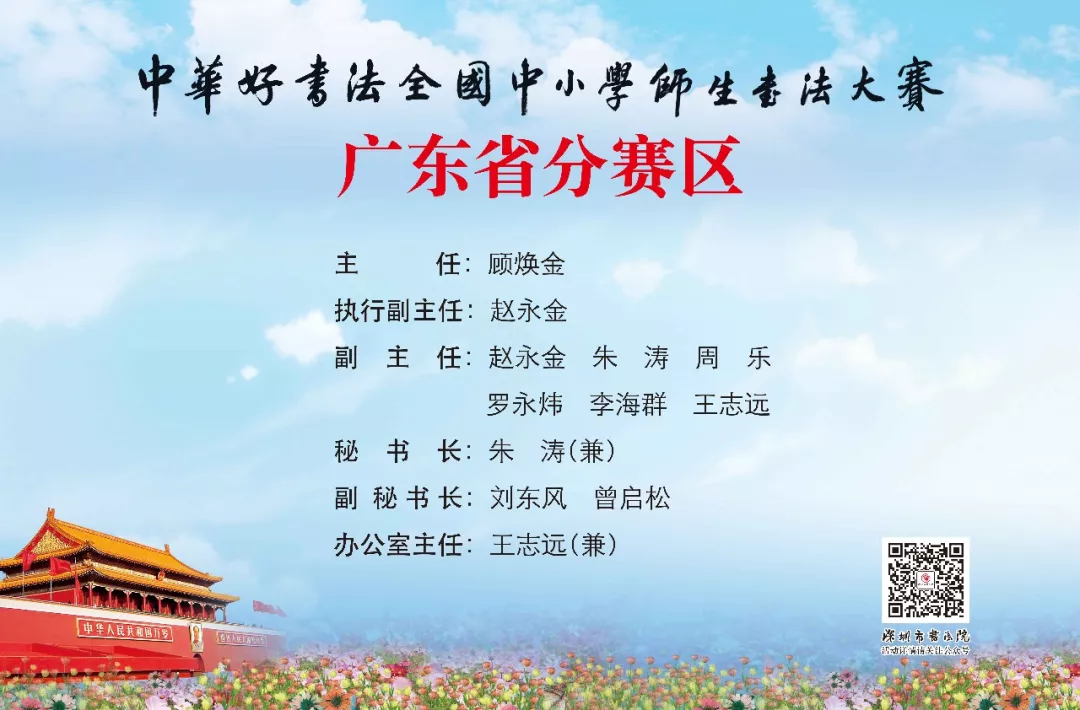 啟動(dòng)儀式宣布成立“中華好書法”全國中小學(xué)師生書法大賽廣東省分賽區(qū)組委會(huì)、評(píng)委會(huì)和秘書處等工作機(jī)構(gòu)。顧煥金任廣東省分賽區(qū)組委會(huì)主任,趙永金任廣東省分賽區(qū)組委會(huì)執(zhí)行副主任,朱濤、羅永煒、周樂、李海群、王志遠(yuǎn)任廣東省分賽區(qū)組委會(huì)副主任,朱濤兼廣東省分賽區(qū)組委會(huì)秘書長,劉東風(fēng)、曾啟松任廣東省分賽區(qū)組委會(huì)副秘書長,王志遠(yuǎn)兼任廣東省分賽區(qū)組委會(huì)辦公室主任。