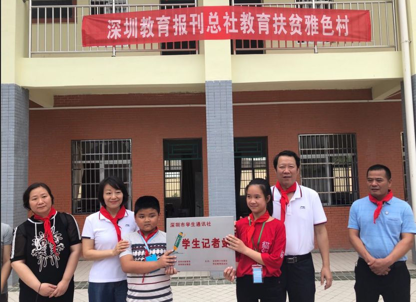 在捐贈儀式上,同學(xué)們?yōu)檫h(yuǎn)道而來的叔叔阿姨系上了紅領(lǐng)巾,這些“大紅領(lǐng)巾”陪著“小紅領(lǐng)巾”,提前歡慶六一兒童節(jié)的到來??偵邕€為雅色的孩子帶來一份大禮,那就是深圳學(xué)通社學(xué)生記者站在頌平小學(xué)掛牌。