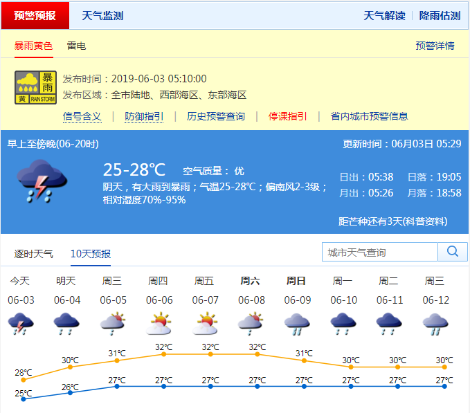 【上班天氣】預(yù)計(jì)早晨6-9時(shí),全市陰天,有大雨到暴雨;氣溫25-27℃;偏南風(fēng)2-3級(jí),雨時(shí)最大陣風(fēng)6-7級(jí);相對(duì)濕度85%-100%;全市能見度3-10公里,雨時(shí)能見度較差,注意交通安全;降雨時(shí)間長,請(qǐng)合理做好出行安排。深圳市氣象臺(tái)2019年06月03日05:39發(fā)布。
