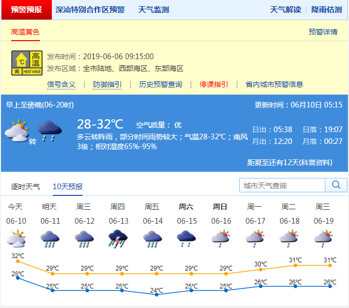 深圳新聞網(wǎng)2019年6月10日訊 在近幾日副熱帶高壓的影響下,深圳迎來了久違的“深圳藍(lán)”。不過,市民們在享受通透的藍(lán)天夏日的同時(shí),也承受著不斷升溫的“燒烤模式”。2019年6月6日上午09時(shí)15分深圳市氣象臺發(fā)布了今年的首個(gè)高溫黃色預(yù)警信號,2019年6月9日羅湖區(qū)東門自動(dòng)站記錄到36.2℃高溫。氣溫圖上一片橙色紅色,簡直成了一只“紅燒雞腿”。