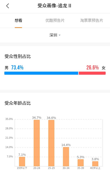 阿里影業(yè)旗下的燈塔專業(yè)版數(shù)據(jù)中顯示,深圳影迷在《追龍2》的受眾畫像男性占比73.4%,遠高于女性,且在受眾年齡占比當中,20-30歲群體是主要受眾群。