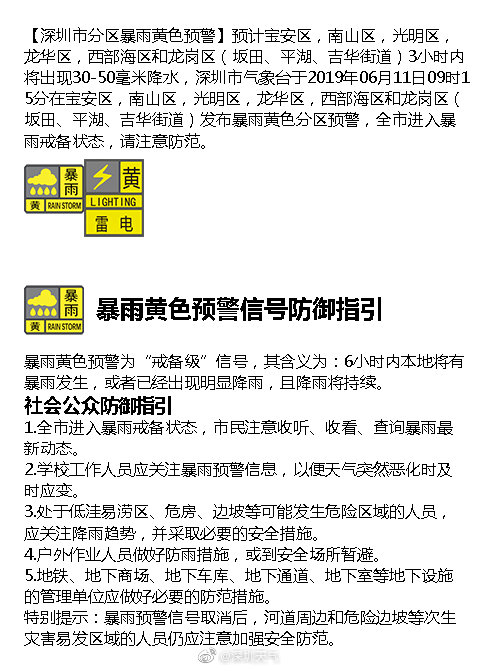 【深圳市分區(qū)暴雨黃色預警】預計寶安區(qū),南山區(qū),光明區(qū),龍華區(qū),西部海區(qū)和龍崗區(qū)(坂田、平湖、吉華街道)3小時內將出現(xiàn)30-50毫米降水,深圳市氣象臺于2019年06月11日09時15分在寶安區(qū),南山區(qū),光明區(qū),龍華區(qū),西部海區(qū)和龍崗區(qū)(坂田、平湖、吉華街道)發(fā)布暴雨黃色分