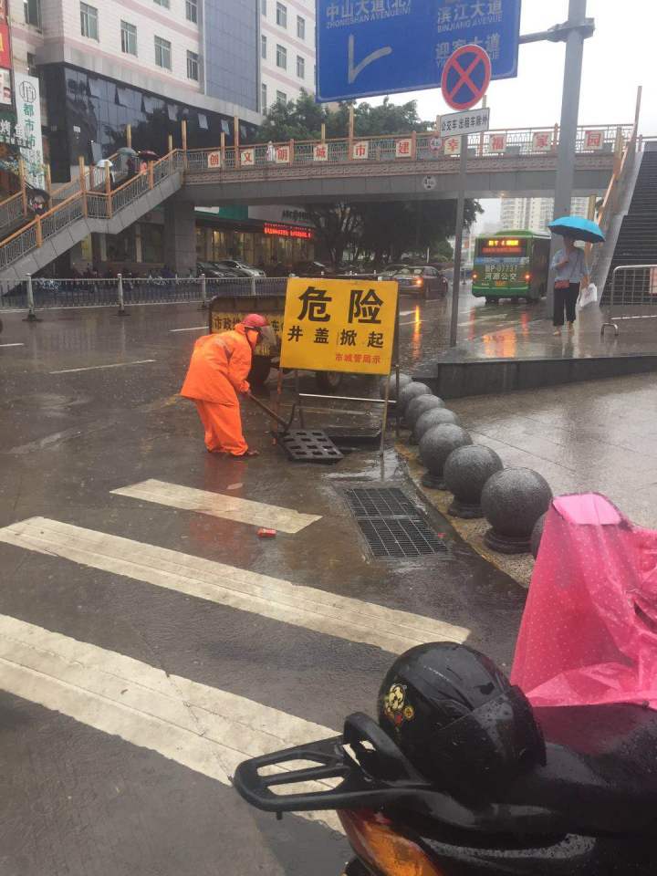 市城管部門已加派工作人員,加班加點(diǎn),打開華怡路口等易澇點(diǎn)井蓋并設(shè)置警示牌,加大對(duì)市區(qū)排水的力度。