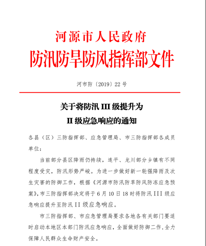 當(dāng)前部分縣區(qū)降雨仍持續(xù),連平、龍川部分鄉(xiāng)鎮(zhèn)有不同程度受災(zāi),防汛形勢(shì)嚴(yán)峻。為進(jìn)一步做好新一輪強(qiáng)降雨及次生災(zāi)害的防御工作,根據(jù)《河源市防汛防旱防風(fēng)防凍應(yīng)急預(yù)案》,市三防指揮部決定將于6月10日18時(shí)將防汛III級(jí)應(yīng)急響應(yīng)提升至防汛II級(jí)應(yīng)急響應(yīng)。