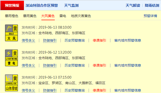 深圳市氣象臺(tái)于2019年06月13日08時(shí)10分在全市發(fā)布大風(fēng)黃色預(yù)警,預(yù)計(jì)平均風(fēng)力將達(dá)8級(jí)以上(或陣風(fēng)10級(jí)以上),信號(hào)可能從今天夜間持續(xù)到明天早晨,停止高空、水上等戶外作業(yè),撤離危險(xiǎn)地帶人員;船舶采取有效措施避風(fēng),請(qǐng)市民遠(yuǎn)離海邊,盡量避免海上活動(dòng)。