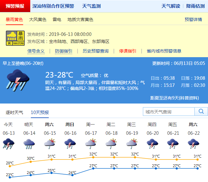 記者了解到,13日深圳有暴雨,局部大暴雨,伴雷暴和短時(shí)大風(fēng);氣溫在24-28℃;偏南風(fēng)2-3級(jí);相對(duì)濕度85%-100%。